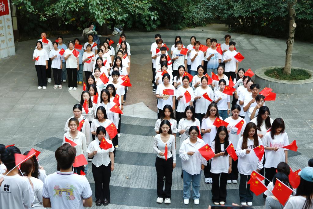 随后,24级新生们以匠心独运的方式排列成醒目的“75”字样,随着《歌唱祖国》的悠扬旋律,大家纷纷挥舞着手中的五星红旗,用他们最真挚的情感,用青春之歌向祖国表达着无尽的敬意和热爱。